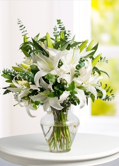 Şeffaf Vazoda Mis Kokulu Beyaz Lilyumlar