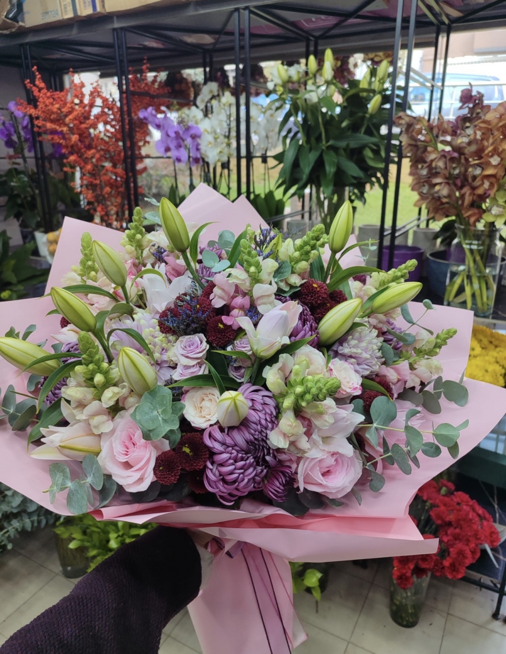 Zarif pastel tonların morun asil dokunuşuyla buluştuğu bu özel tasarım buket, sevdiklerinize duygularınızı en şık şekilde ifade etmeniz için hazırlandı. Lilyum, lisyantus, krizantem, gül ve mevsim çiçeklerinin uyumu; taze yeşilliklerle harmanlanarak modern bir görünüm kazandırıldı.
