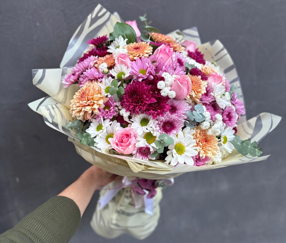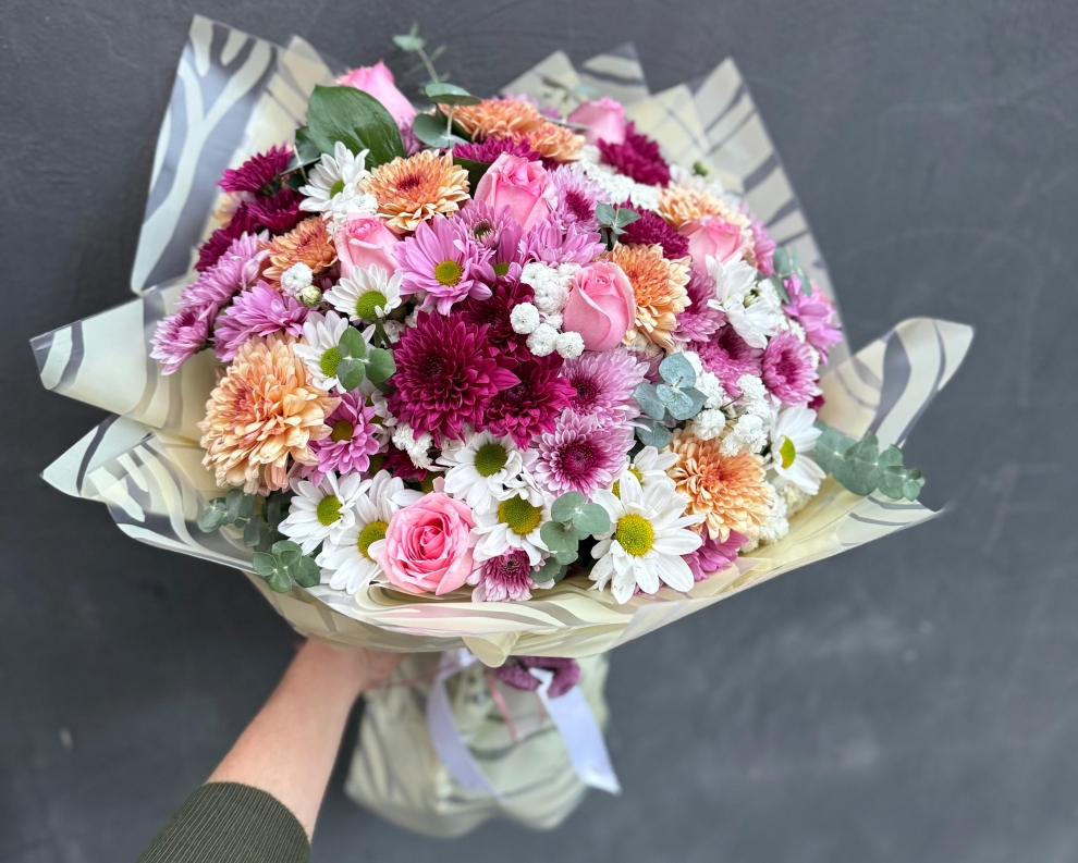 Pembe güller, karışık kasımpatılar, beyaz papatyalar ve mevsim çiçekleriyle hazırlanmış, hacimli ve renk uyumu yüksek zarif bir buket.