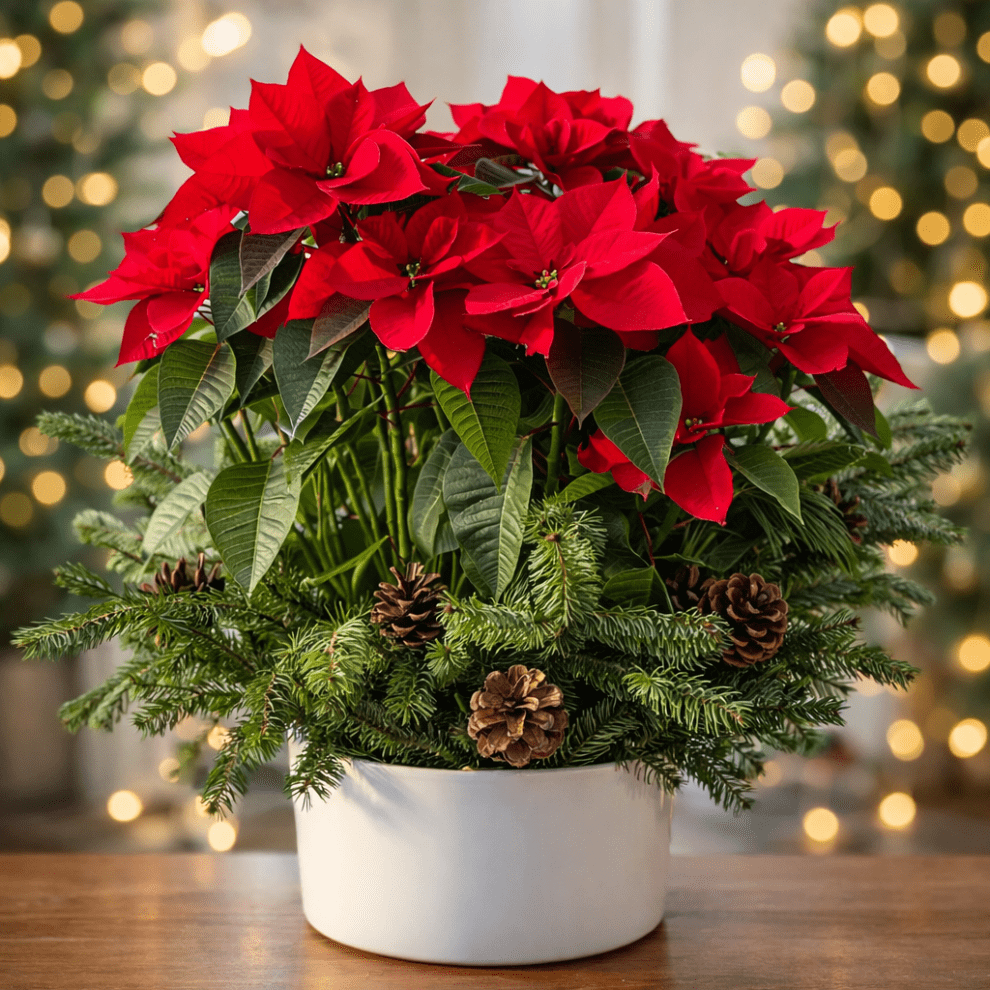 Yılbaşının vazgeçilmez simgesi Yılbaşı Yıldızı (Atatürk Çiçeği), çam dalları ve kozalak detaylarıyla Nora Flowers’ın özel tasarımı olarak hazırlandı. Canlı kırmızı yaprakları ve doğal dokusu ile evlere, ofislere ve özel anlara sıcak bir yılbaşı atmosferi katar.